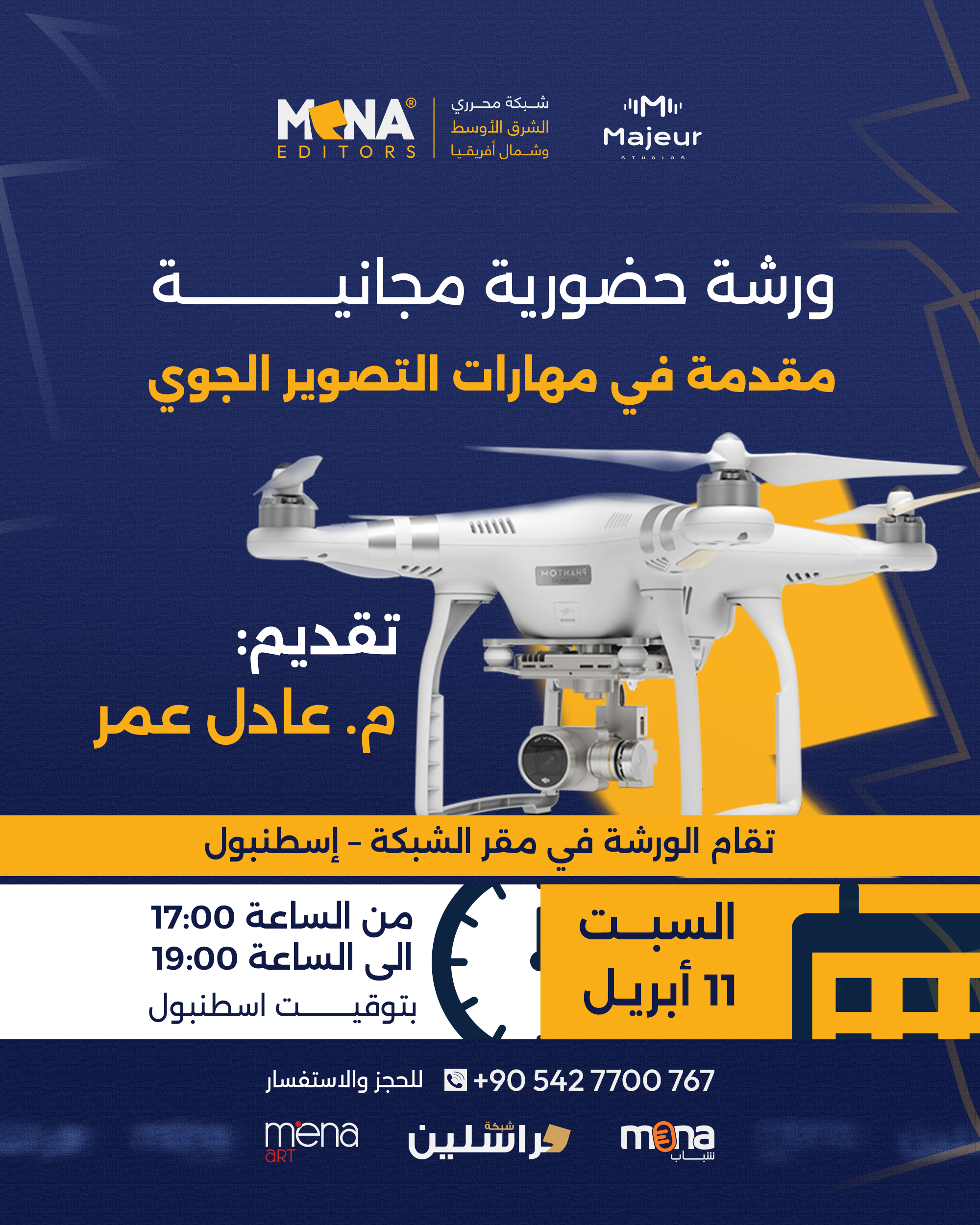 أعلنت شبكة محرري الشرق الأوسط وشمال أفريقيا تنظيم ورشة حضورية بعنوان “مقدمة في مهارات التصوير الجوي”، وذلك في مقر الشبكة بمدينة إسطنبول، ضمن جهودها المتواصلة في رفع كفاءة صناع المحتوى وتطوير مهاراتهم العملية، ومواكبة التحولات المتسارعة في أدوات الإنتاج الإعلامي والرقمي.