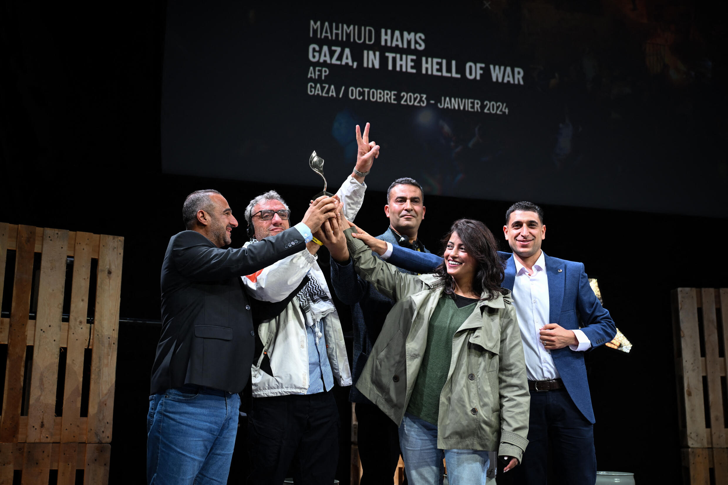 On stage stood seven AFP journalists who documented the outbreak of the 2023 Gaza war: