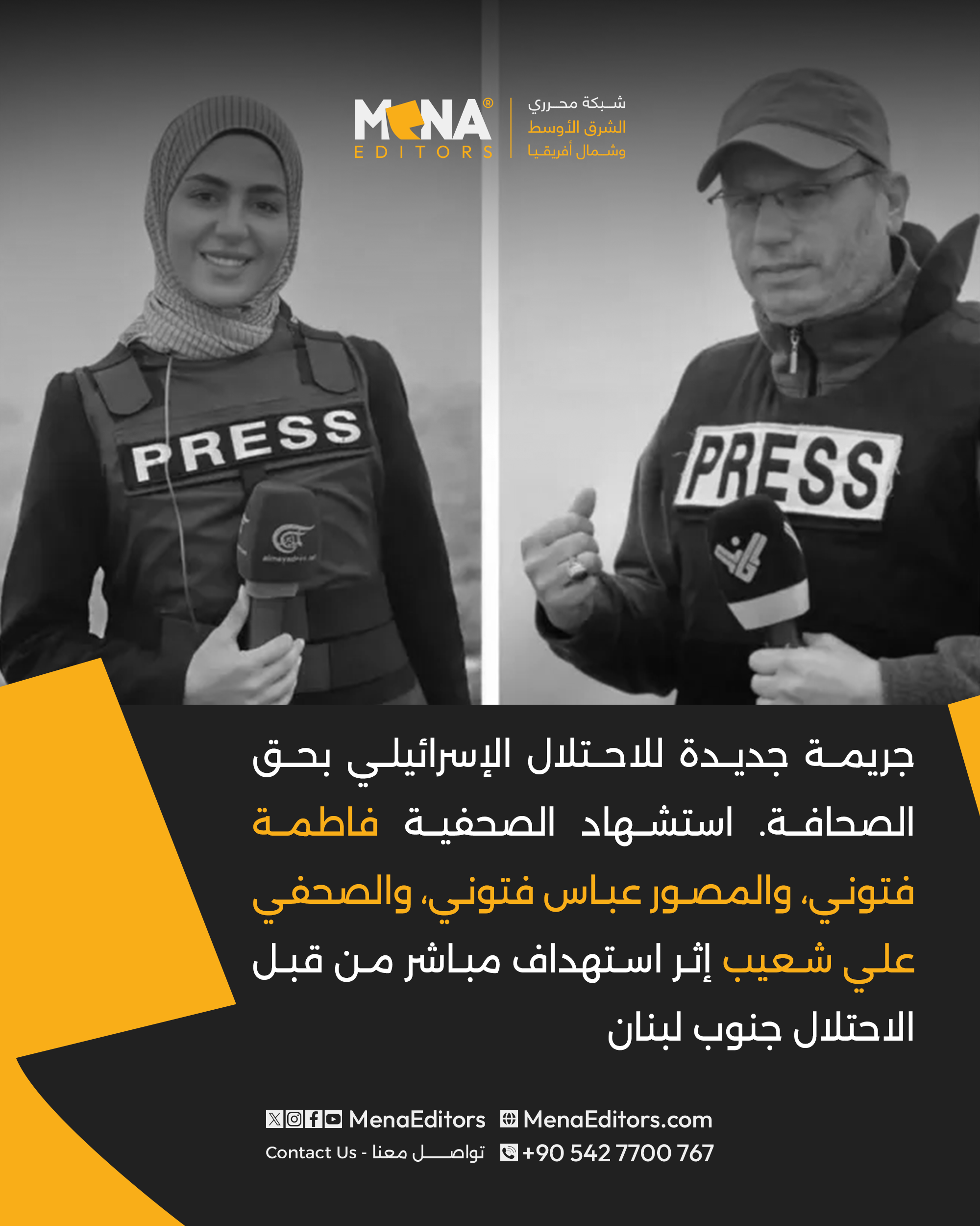 أدانت شبكة محرري الشرق الأوسط وشمال أفريقيا (MENA Editors Network) استهداف الاحتلال الإسرائيلي لعدد من الصحفيين في جنوب لبنان، في حادثة أسفرت عن استشهاد الصحفية فاطمة فتوني، والمصور عباس فتوني، والصحفي علي شعيب، أثناء تأديتهم لعملهم الإعلامي في الميدان.
